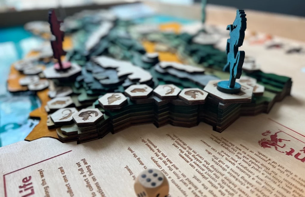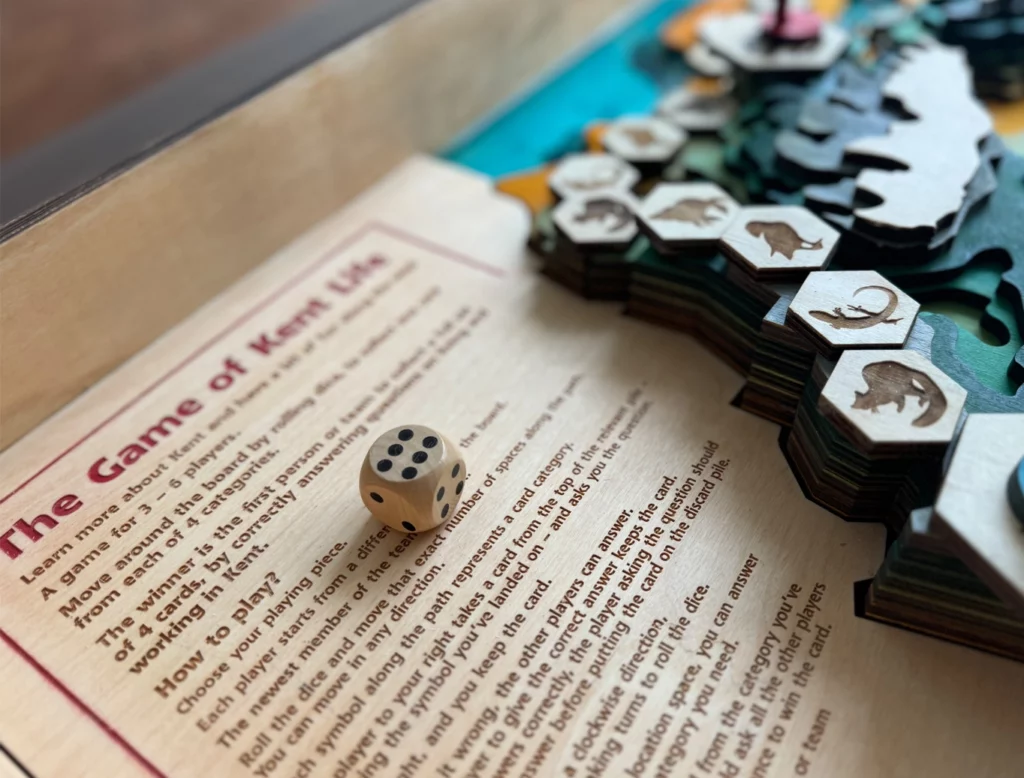 The Game of Kent Life. A beautifully, laser-cut, hand painted and assembled board game, big enough for a boardroom centrepiece but small enough to be used in conjunction with hiring events.