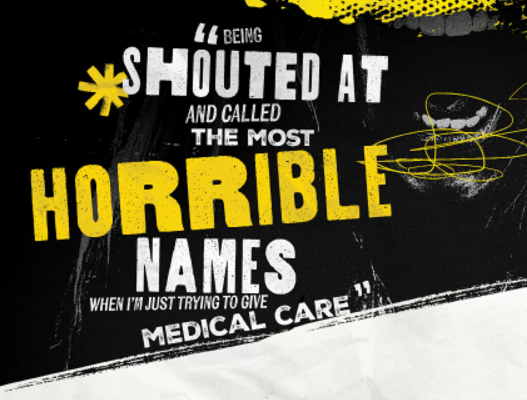 A campaign designed to make everyone stop and think – With headlines based on real stories, this campaign had to stand out from the usual NHS blue and people photography. We also wanted to do justice to the Trust employees who’d spoken openly and frankly about their experiences. For this campaign to have any impact, it was important not to shy away from the truth and the harmful effect these incidents can have.
